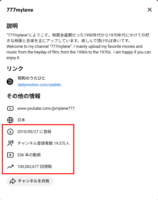 私が開設しているYouTubeチャンネル「777mylene」のトップページです。2月9日現在、チャンネル登録者数 193,264人、236本の動画、チャンネルの総再生回数 100,062,677回です。チャンネルを開設したのは2010年5月27日です。1億回突破したのは一昨日(2/8)でした。1000万回、2000万回、5千万回とそれなりに節目はありますが、Yotuberにとって、再生回数1億回突破は、やはり記念すべき節目だと思います。
