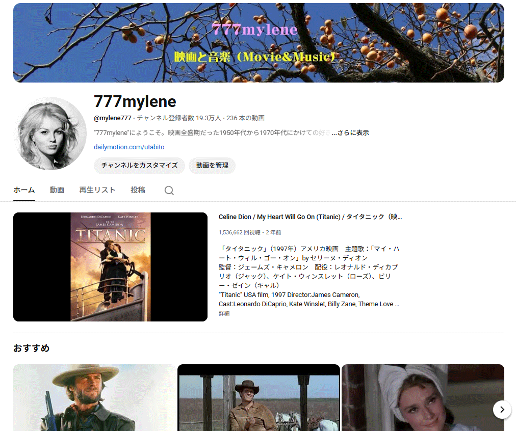 直近1年間は、チャンネルの1日当り再生回数40,000~45,000回、登録者数 70人~120人です。1ヵ月平均で再生回数125万回、登録者数3万人ペースで毎月増加してきました。チャンネルのハンドルネームは「777mylene」、アイコンは、フランス女優のミレーヌ・ドモンジョです。3年前、87歳でこの世を去りました。Tube主は、ミステリアスの方がいいので、あえて好きな女優さんにしました。団塊世代以前生まれでないと知る人はいないと思います。