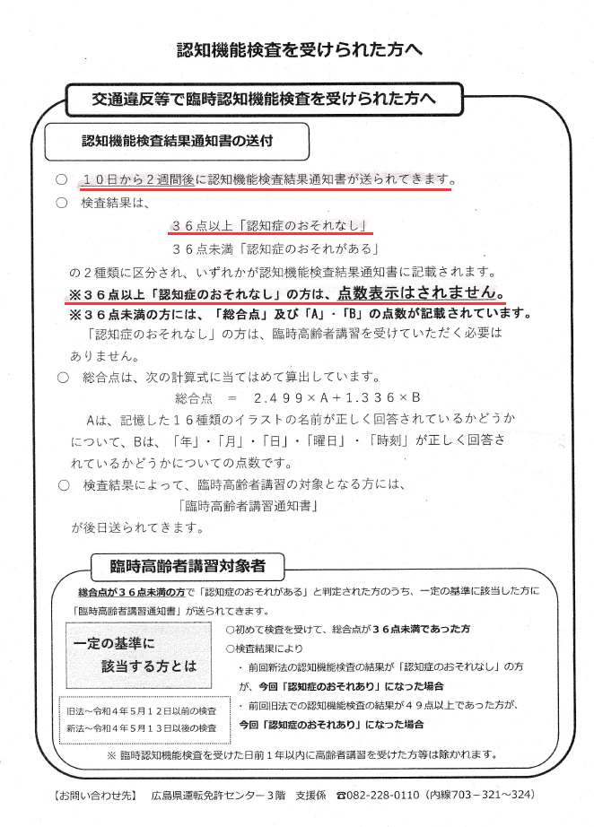 検査員がそばにきて、あなたは認知症でないと判定されたので、上記の印刷物を渡され、帰ってよろしいと言われました。併せて、本日の検査結果は、約2週間後に届きますと説明がありました。また、合格した人は「認知機能検査結果通知書」に点数表示はありませんが、合格点に達しなかった人は、点数表示が知らされるようです。