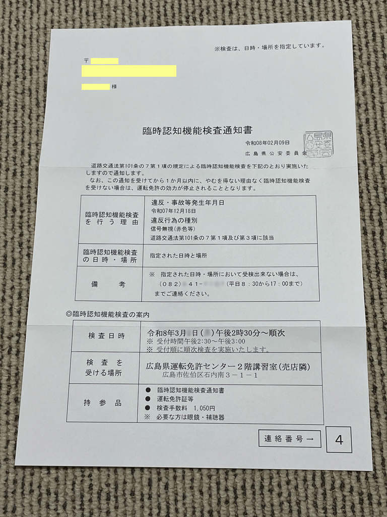 交通違反から2ヵ月後に「臨時認知機能検査通知書」が届きました